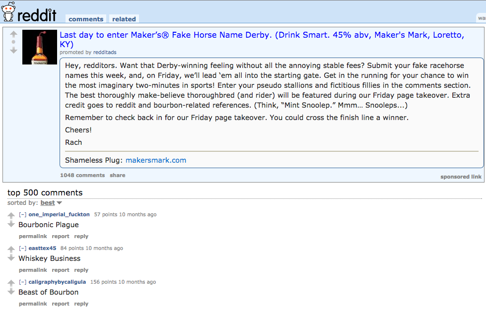 A foray into Reddit was similarly successful, which surprisingly few brands can honestly claim. Maker’s Mark was the first liquor brand to test the platform’s waters in December 2013, and last spring published a simple yet effective campaign that took advantage of the Kentucky Derby to reel in user interest.