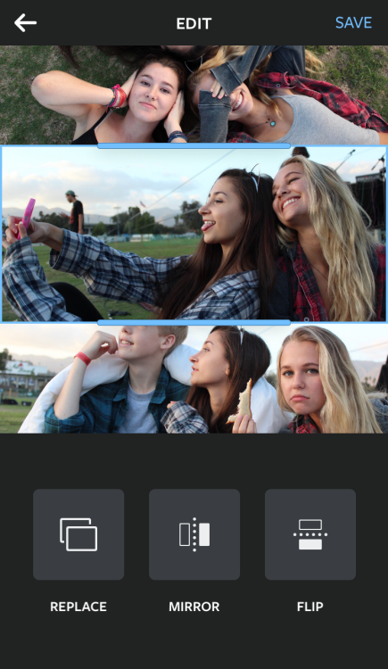 From there, you can resize, zoom, mirror, rearrange, and flip images within the grids. You can also easily replace photos with different ones by pulling up your camera roll and swapping with a tap. Facebook users seem be to having fun with the mirror feature in particular, by creating funny and imaginative images.